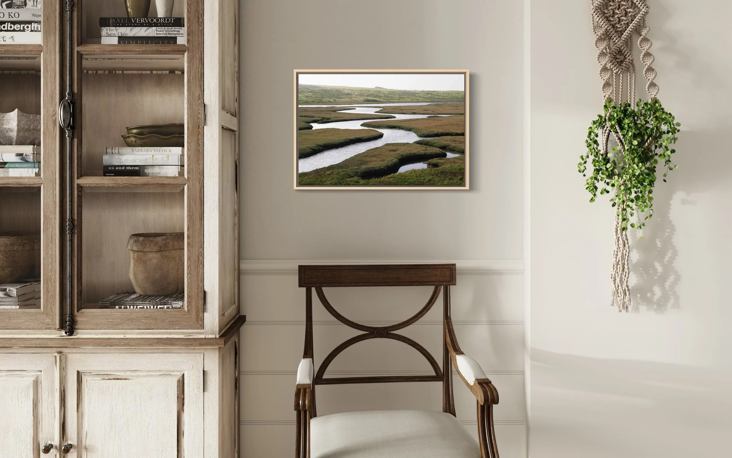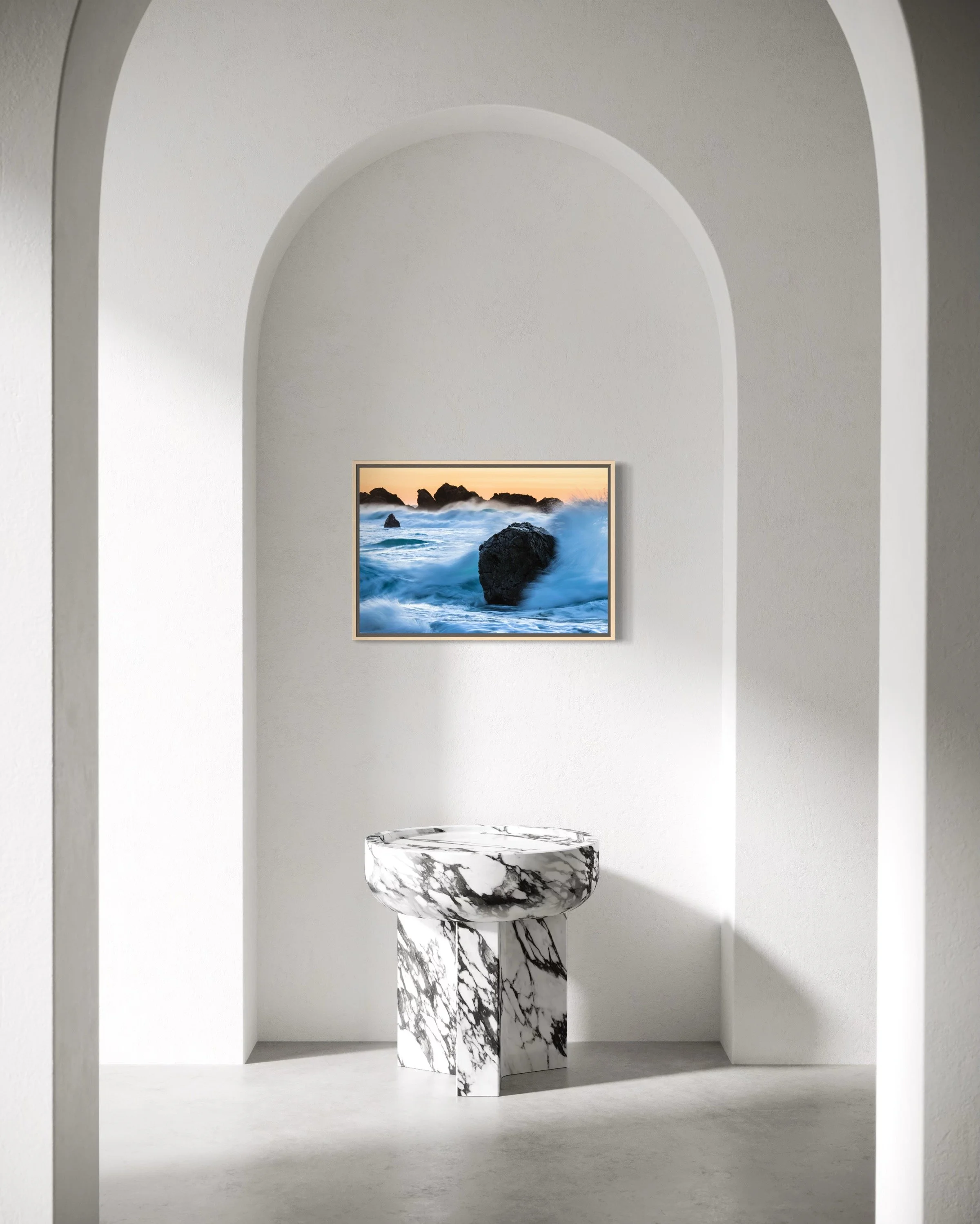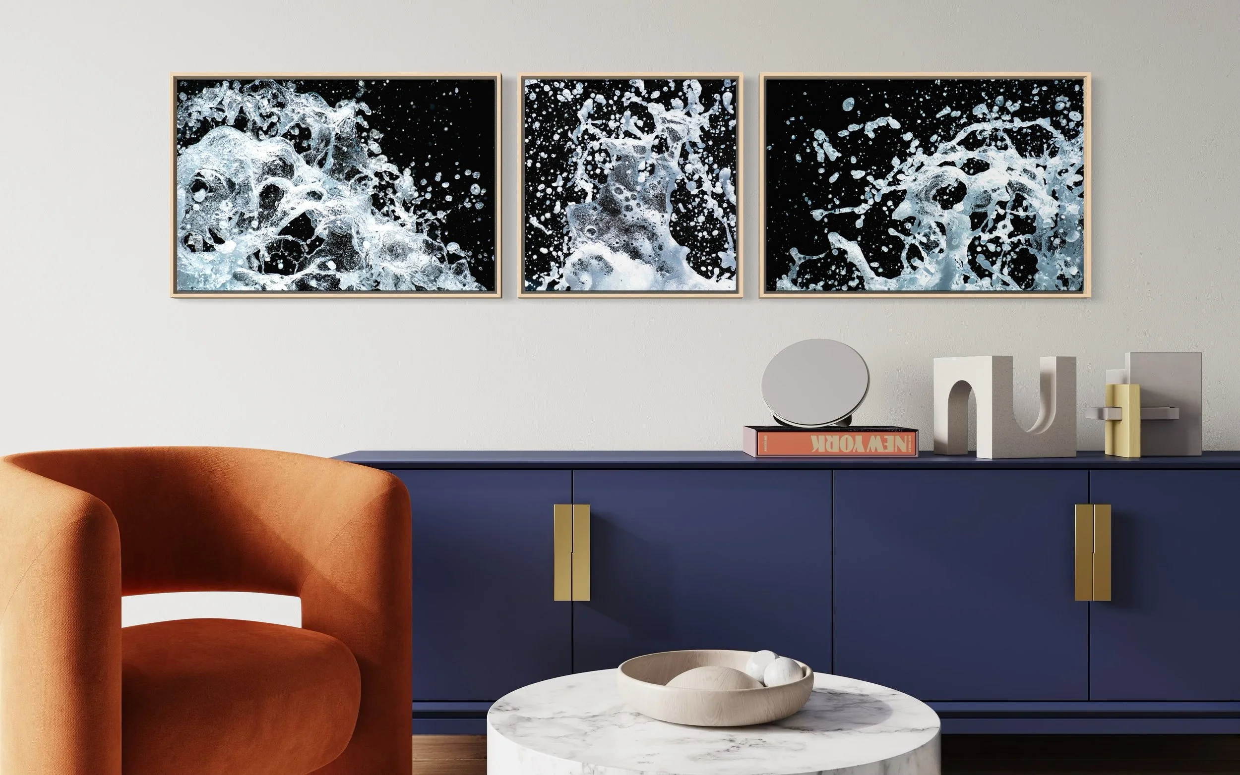 Triptych of 20x30”, 20x20”, and 20x30” pieces in inventory as HD dye infused metal prints with maple wood float frames. Regular price: $2800, Sale price: $2240